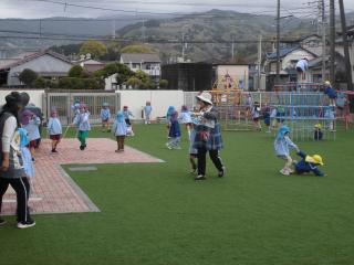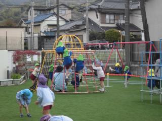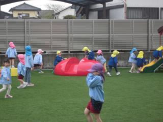 • この赤い遊具の名前は「おもち」といいます。年少たんぽぽ組さんが楽しんでいました。