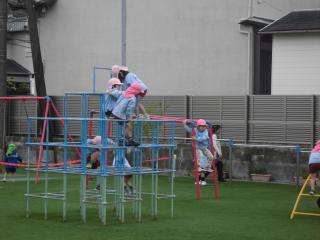 • この遊具の名前は「ジャングルジム」といいます。年中さくら組さんがさっきまでもっと大勢登っていました。シッターチャンスを逃してしまいました。