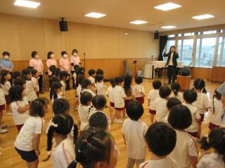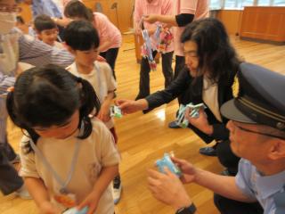 ホーム 1コマダイアリー 防犯教室いかのおすし 防犯教室いかのおすし 2025年06月03日 富士警察署の方と富士エレガンス(子どもたちの為に連れ去り防止の活動をしています)の方に連れ去り防止の合言葉を教えていただきました。 “いか”ない “の”らない “お”おごえをだす “す”ぐにげる “し”らせる 歌を作った山作戰さんが、歌詞に込めた意味を教えてくれました。 「いってきます」「いってらっしゃい」 「ただいま」「おかえりなさい」と無事に帰ってくることを願う歌詞だそうです。 歌っている写真はまた後で掲載します。 ♫いかのおすし~ 行ってきますと、ただいまが 行ってらっしゃいと、お帰りが 絶対はぐれないように~ 3.2.1.助けて~ 調子のよい音楽にノリノリの子どもたち。 よく話を聞いたご褒美に、エレガンさんたち手作りのメダルとポケットティッシュをいただきました。“いかのおすし”をしっかり覚えた子どもたちです。