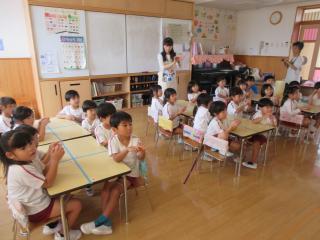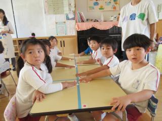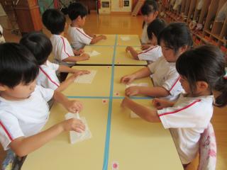 ホーム 花王手洗い教室 年中 花王手洗い教室 年中 2025年09月19日 お空で「よーこ」「たーて」を順番にやって、机を拭く練習中! 机を拭くシートを、自分の手の大きさに合わせて折るよ プロジェクターの映像に合わせて、拭いてみよう! 歌に合わせて、手洗い練習をしたよ