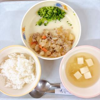 ホーム 10月24日の給食 10月24日の給食 2025年10月24日 ・ごはん ・豚大根べっこう煮 ・ブロッコリーのマヨ焼き ・豆腐とえのきのスープ こちらは離乳食完了期のメニューです。 ・ごはん ・豚大根煮 ・茹でブロッコリー ・豆腐スープ 15時のおやつは《ビスコ、薄焼きせんべい》でした♪ 黄色グループの食べ物は『ちからのもと』 赤色グループの食べ物は『からだのもと』 緑色グループの食べ物は『げんきのもと』 今日も3つのグループの食材がそろいました♪