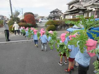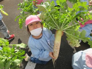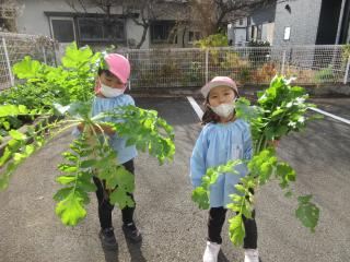 ホーム 大根を収穫したよ!(年中) 大根を収穫したよ!(年中) 2025年12月19日 根元を持って、うんとこしょ! 力を込めて抜くよ! 採れた大根をお互いに見せっこ♪ 頑張って採れたよ! 見て!とっても大きいでしょ❤ 採った大根を持って幼稚園へ! 後姿がかわいいです♪