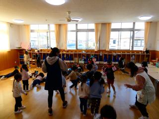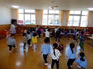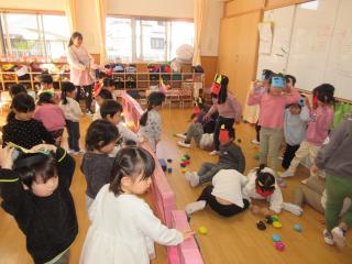 ホーム 豆まき交流をしたよ 豆まき交流をしたよ 2026年02月03日 園長先生に豆まきをしてもらったよ 豆まきの由来を教えてもらいました。 真剣に聞いていた子どもたちです。 年長さんが鬼、年少さんが紙で作った豆で、「おには~そと、ふくは~うち」と、鬼退治。 鬼は、豆を投げられて倒れているよ。 ばら組さんのお部屋でも、まめまきをしたよ。 脅かし方もやさしい感じでした。