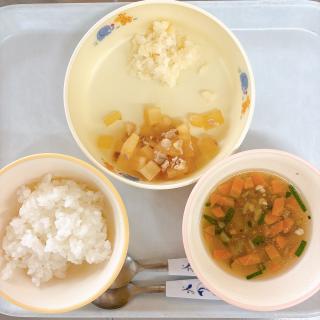 ホーム 4月13日の給食 4月13日の給食 2026年04月13日 ・ごはん ・豚大根べっこう煮 ・焼きカレイ ・沢煮椀 こちらは離乳食《完了期》メニューです。 ・軟飯 ・豚肉と大根の煮物 ・焼きカレイほぐし ・沢煮椀 15時のおやつは《味しらべ、ハーベスト》でした♪