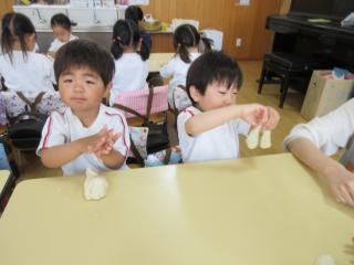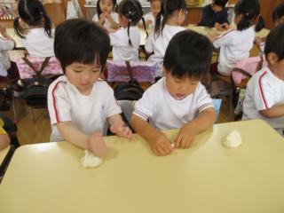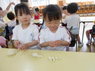 ホーム 1コマダイアリー 小麦粉粘土をして遊んだよ!(年少) 小麦粉粘土をして遊んだよ!(年少) 2026年04月15日 びよーん!長く伸びるね! 手でたたいてぺったん! 平らになるかな? 小さいお団子いっぱいできたよ♪ 指輪やブレスレット! おしゃれでしょ? いろんな形ができて楽しいね♪