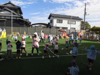 園庭で発表会の踊りの曲をかけ、いろんなクラスの踊りを楽しそうに踊っていました。