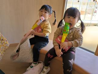 お兄さん、お姉さんのお店にお買い物へ行ってきたゆり組さん。「おにぎり!」「バナナ!」と嬉しそうにたくさんお買い物をして、お土産もいっぱい♫ふじ組さんのお店では、輪投げやメリーゴーランドをやったり、ちょっと怖い迷路へ入ったり、、ニコニコドキドキ、とってもたのしいお店屋さんごっこでした♡