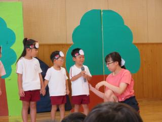 先生たちの出し物は「金のおの 銀のおの」年長さんのサマープログラムの時にもやったものです。先生たちの演技力に引き込まれ、楽しく見ていました。