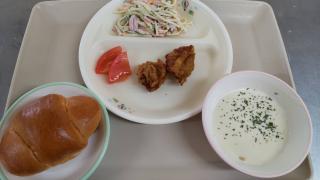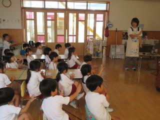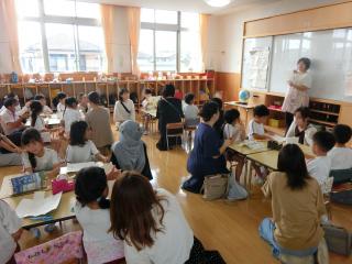 プロジェクターを見ながら、机の正しい拭き方、手の洗い方を教えてもらいました。