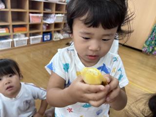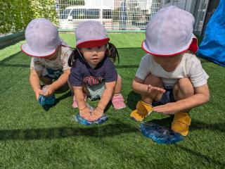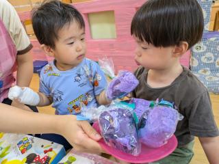 園で育てているバタフライピーというお花を摘んで、色水を作り、小さいペットボトル容器に色水とお花を入れてきれいなセンサリーボトルを作りました☆そこにレモン汁を入れると、青色から紫色に変化!子どもたちは「きれい~!」とびっくり♫すてきなボトルが出来たね!